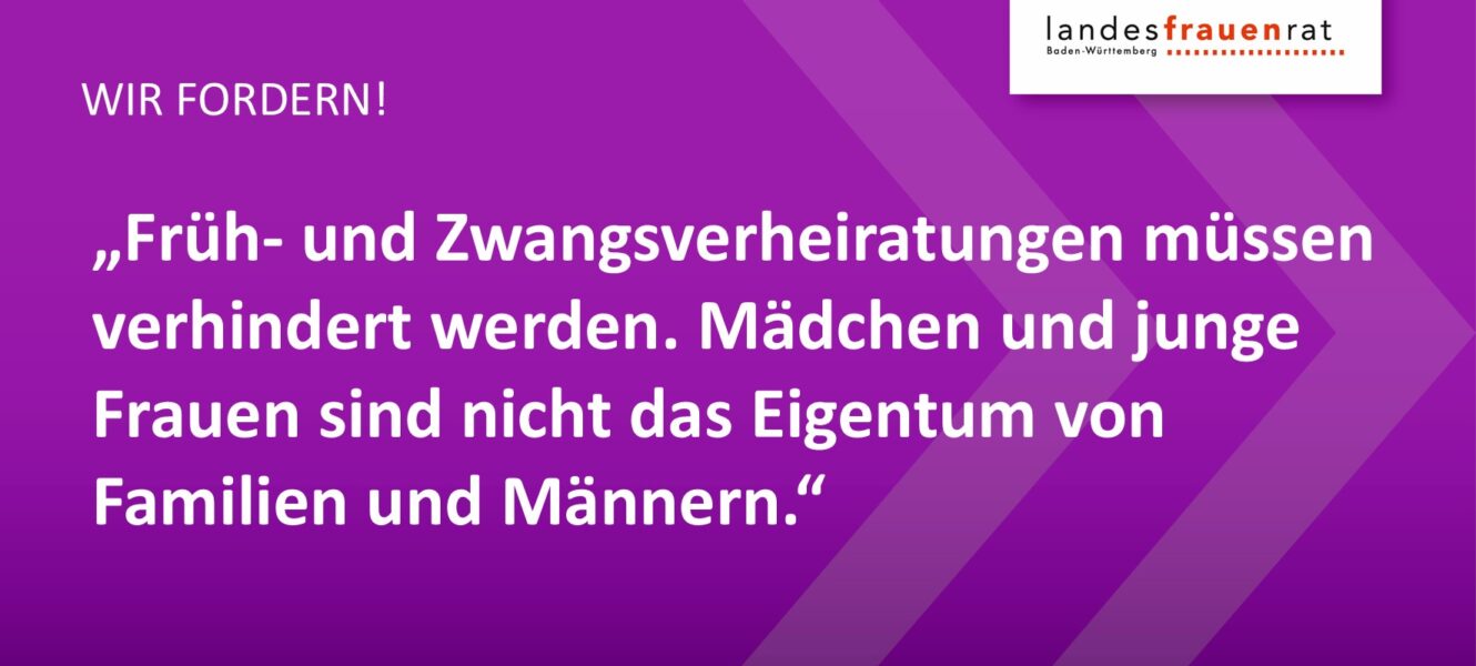 Mädchen und junge Frauen werden auch in Deutschland immer noch Opfer von Früh- und Zwangsverheiratungen. Sie werden aufgrund patriarchaler Strukturen häufig als Eigentum von Familien und Männern, des Vaters oder des Ehemanns, angesehen. Sie werden allein auf die Rolle als Ehefrau und Mutter reduziert. Deutschland ist verpflichtet, die Verschärfung der EU-Menschenhandelsrichtlinie von 2024 bis zum 15.07.2026 umzusetzen. Der Landesfrauenrat Baden-Württemberg (LFR BW) mahnt die dringliche Umsetzung der Änderungen am Europäischen Tag gegen Menschenhandel an, der jährlich am 18.10. begangen wird.