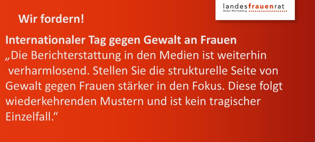 Zum Internationalen Tag gegen Gewalt an Frauen appelliert der Landesfrauenrat Baden-Württemberg (LFR BW) an die Medien, die strukturelle Seite von Gewalt gegen Frauen stärker in den Fokus zu rücken. „Statt Taten in einer besonders tragischen Konstellation isoliert und als von einzelnen Tätern begangen darzustellen, müssen die wiederkehrenden Muster in der Gewalt gegen Frauen und deren Alltäglichkeit konsequent thematisiert werden“, fordert Verena Hahn, Zweite Vorsitzende des LFR BW. Bereits die hohen Fallzahlen bei Gewalt gegen Frauen und häusliche Gewalt in der Kriminalstatistik in Deutschland, abgesehen von der darüber hinaus hohen Dunkelziffer, zeichneten ein anderes Bild: „Es handelt sich um einen strukturellen Missstand, demzufolge unsere Gesellschaft weiterhin Frauen schlechterstellt und sowohl Männer als auch Frauen in überkommene Rollenstereotype drängt.“
