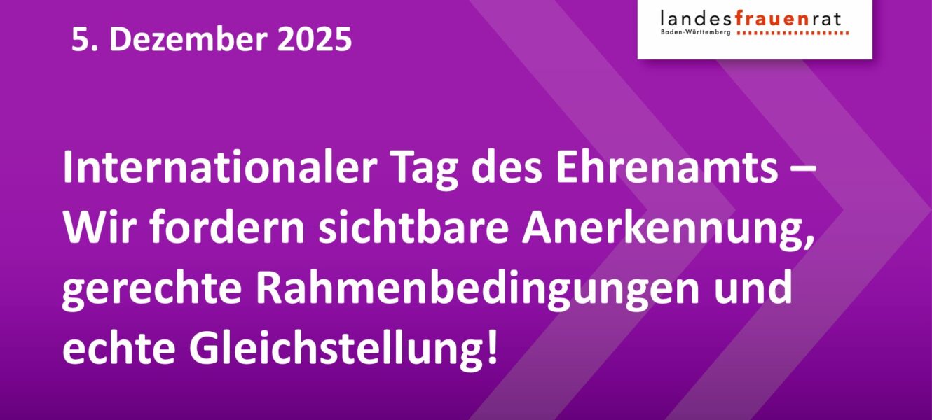 Zum Internationale Tag des Ehrenamtes am 05.12.2025 erinnert der Landesfrauenrat Baden-Württemberg (LFR BW) daran, dass demokratisches Engagement nur dann nachhaltig und wirksam sein kann, wenn die Leistungen aller Geschlechter gleichermaßen gewürdigt und sichtbar gemacht werden. Denn auch im ehrenamtlichen Engagement von Frauen und Männern ist gute Gleichstellungspolitik ein Basisbaustein unserer Demokratie.