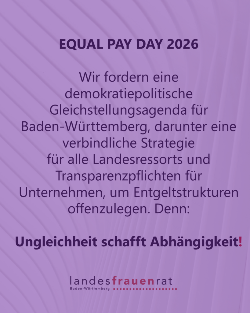 Zum Equal Pay Day am 27. Februar 2026 weist der Landesfrauenrat Baden‑Württemberg (LFR BW) erneut auf die gravierenden Lohnunterschiede zwischen Frauen und Männern hin. Zwar ist der Gender Pay Gap bundesweit von 2023 auf 2024 um zwei Prozentpunkte gesunken, liegt aber weiterhin bei 16 Prozent – in Baden‑Württemberg sogar bei 19 Prozent. Der Verband macht deutlich: Lohngerechtigkeit ist eine Grundvoraussetzung für eine starke, widerstandsfähige Demokratie.