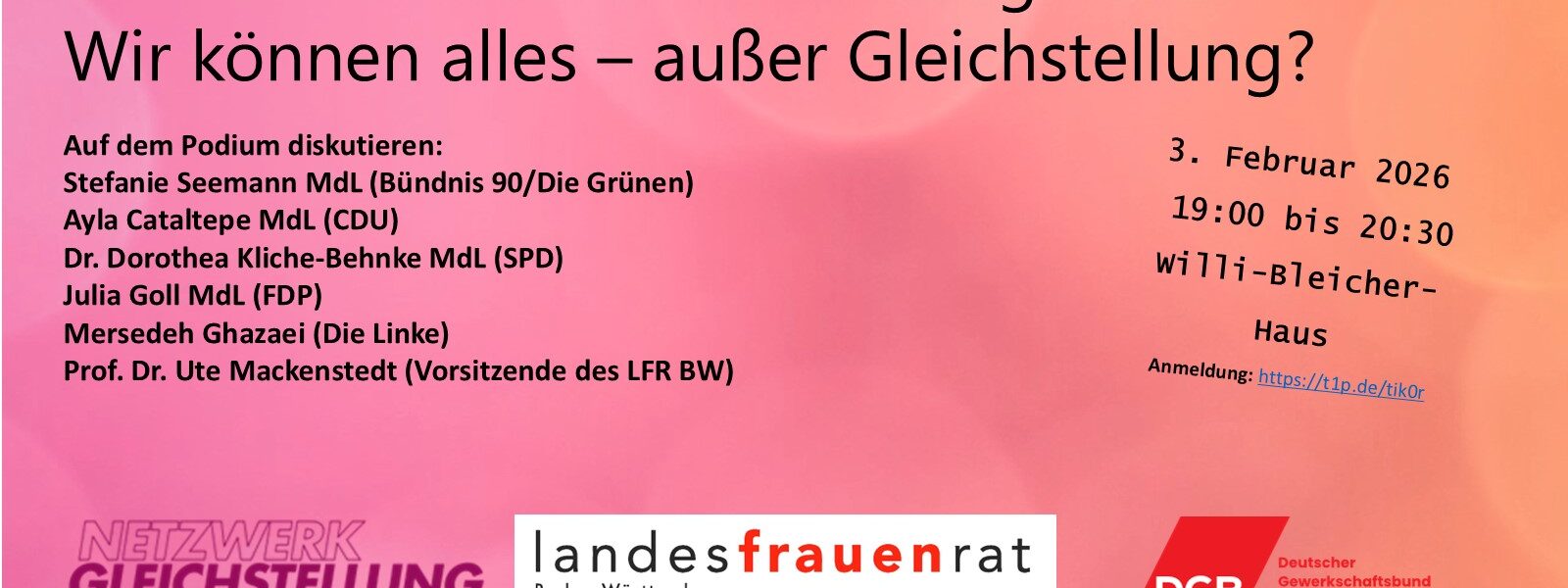 Podiumsdiskussion zur Landtagswahl: Wir können alles – außer Gleichstellung? Welche Konzepte verfolgen die Parteien für eine feministische und zukunftsgerichtete Gleichstellungspolitik in Baden-Württemberg? Diese Frage steht im Mittelpunkt einer Podiumsdiskussion des Netzwerks Gleichstellung anlässlich der Landtagswahl. Die Veranstaltung findet am Dienstag, 3. Februar 2026, von 19:00 bis 20:30 Uhr im Willi-Bleicher-Haus (Gewerkschaftshaus) in Stuttgart statt. Eingeladen sind alle Teilnehmenden ab 18:30 Uhr für einen Imbiss und zum Austausch. Gemeinsam mit Abgeordneten der demokratischen Fraktionen im Landtag Baden-Württemberg (Bündnis 90/Die Grünen, CDU, SPD, FDP) sowie der Spitzenkandidatin der Partei Die Linke, will das Netzwerk Gleichstellung zentrale gleichstellungspolitische Herausforderungen und Perspektiven für die kommende Legislaturperiode diskutieren. Grundlage der Diskussion sind Wahlprüfsteine, die vom Netzwerk Gleichstellung mit den DGB-Frauen Baden-Württemberg gemeinsam erarbeitet wurden. „Gleichstellung ist kein Randthema, sondern eine demokratische Kernaufgabe“, betont Prof. Dr. Ute Mackenstedt, Vorsitzende des Landesfrauenrats […]