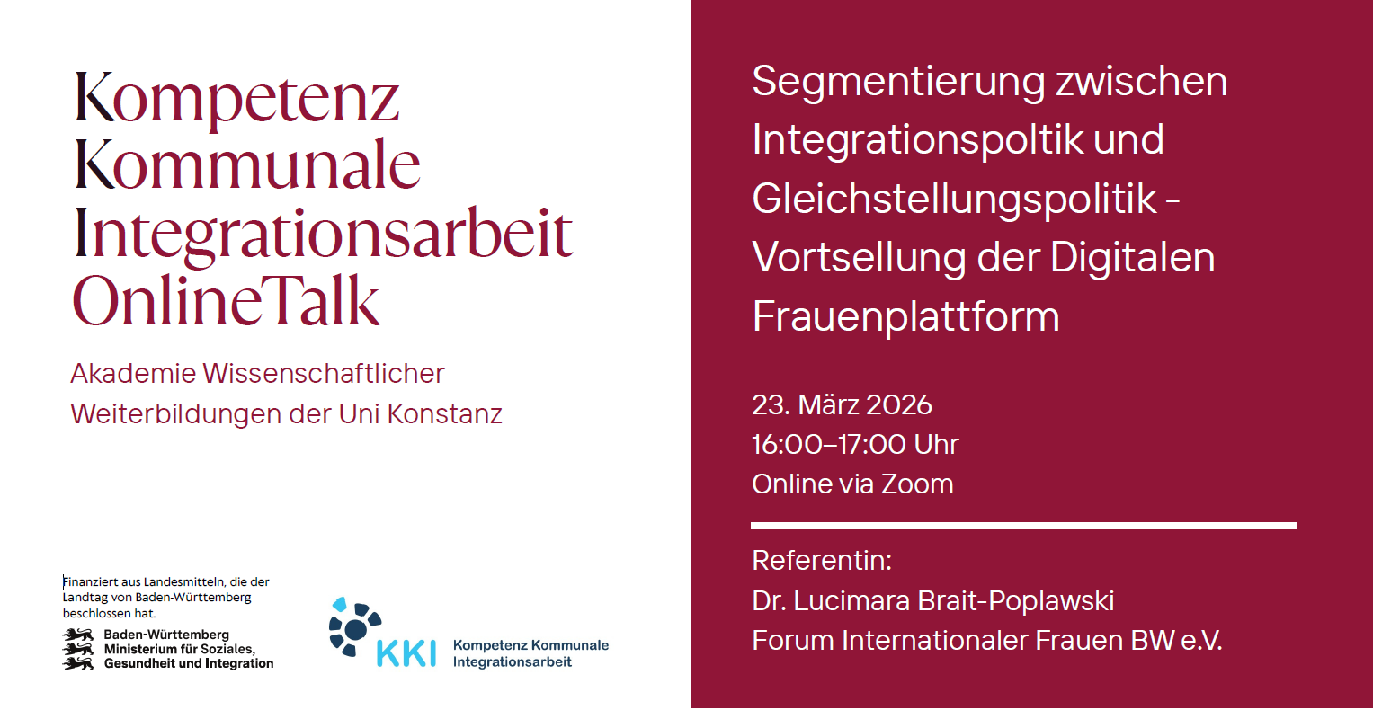Wie können Integrations- und Gleichstellungspolitik die Teilhabe von Frauen mit Migrationsgeschichte wirksam stärken? Trotz aktueller Diskurse um intersektionale Gleichstellung bleibt die praktische Umsetzung oft fragmentiert. Die Veranstaltung stellt die Digitale Frauenplattform vor und zeigt, wie zivilgesellschaftliche Vernetzung neue Anknüpfungspunkte für kommunale Verwaltungsmitarbeitende schaffen kann: zur besseren Ansprache, zur Kooperation mit migrantischen Frauenorganisationen und zur Weiterentwicklung gleichstellungs- und integrationspolitischer Praxis vor Ort. ______________________________________________________________________________________