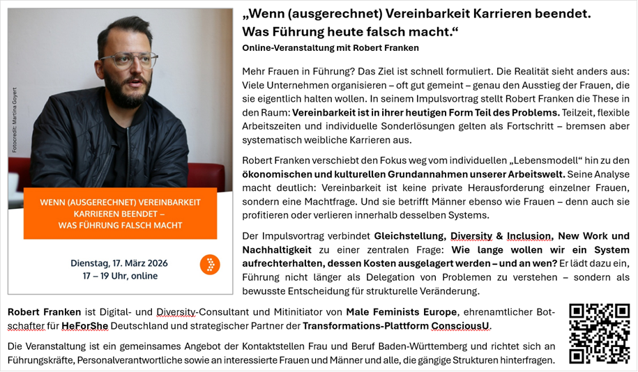 Wenn (ausgerechnet) Vereinbarkeit Karrieren beendet. Was Führung heute falsch macht. von Dagmar Digruber17. Februar 202617. Februar 2026 Sonstiges Wenn (ausgerechnet) Vereinbarkeit Karrieren beendet. Was Führung heute falsch macht. von Zur Anmeldung: https://eveeno.com/vereinbarkeit2026 Datum und Uhrzeit 17. März 2026 17:00 bis 17. März 2026 19:00 Ort Online-Veranstaltung Anmeldeschluss 17. Feb. 2026